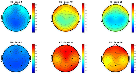 Topographic distribution of MFE values over the scalp for the Reference condition across the 19 EEG channels. The top row represents the HS group, while the bottom row represents the AD group. Each column corresponds to a different scale factor: first column—scale 1; second column—scale 10; third column—scale 20.