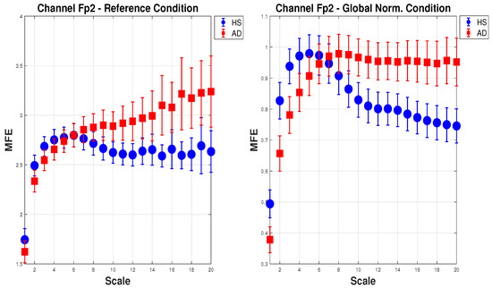 Figure 5 shows the mean of MFE for AD (red squares) and HS (blue dots) with the expanded uncertainty () calculated on 20 scale factors. For brevity, one channel () in the configuration (a) Reference and (e) Global Norm is reported. In the (a) Reference configuration, as the scale increases, the MFE for HS increases slightly and then stabilizes, while the MFE for AD consistently increases, showing a clear separation between the two groups. In the (e) Global Norm configuration, the separation between HS and AD is more pronounced at lower scales, suggesting that Global Norm enhances the distinction between the two groups at all scales. This shows that Global Norm affects the MFE measures, particularly enhancing the differentiation between HS and AD. This may imply that Global Norm is more effective in capturing the entropy characteristics that distinguish the two groups.