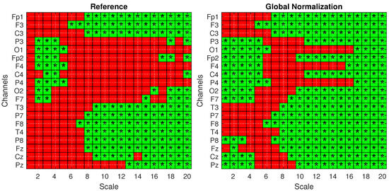 Statistical analysis with one-tailed t-tests with FDR correction for the Reference (left) and Global Norm (right) conditions. Green squares with an asterisk indicate statistically significant results () in distinguishing values from AD and HS subjects. The analysis is shown across 20 scale factors and 19 channels.