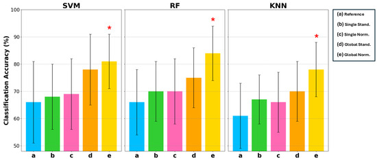 Statistical analysis using a one-tailed t-test with a significance level of confirmed that the improvements in classification accuracy with Global Norm are statistically significant compared to the Reference. Statistically significant results are marked with a star symbol in Figure 7 and in bold in Table 4.