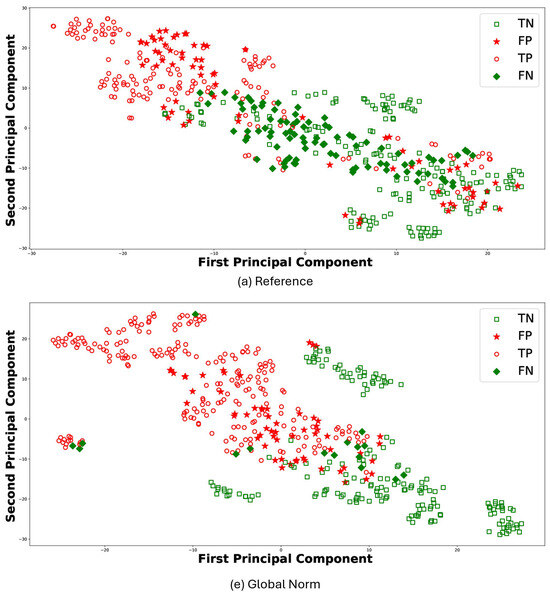 For the sake of brevity, Figure 8 reports the t-Distributed Stochastic Neighbor Embedding (t-SNE) [47] for the results of RF classifier comparing (a) Reference and (e) Global Norm. t-SNE leverages the principal component analysis (PCA), identifying the principal components, in which the data variance is maximized. The t-SNE was performed using a perplexity parameter value of 30 and a single batch that included all features. Each plot visualizes the distribution of data points in terms of the first and second principal components: TP (empty circle), TN (empty square), FP (stars), and FN (diamond). In this context, TP values denote observations correctly predicted as AD, whereas TN values represent observations correctly predicted as HS. The t-SNE visualizations further support the quantitative findings. Under the (e) Global Norm condition, the data points representing true positives (TP) and true negatives (TN) are more distinctly separated compared to the (a) Reference, where there is more overlap. Specifically, most of the TP are located on the left side in (e) Global Norm, while the majority of the TN are on the right. In contrast, in the (a) Reference condition, these two classes do not separate as clearly, resulting in a more overlap between the data points of the two classes. Furthermore, the number of FP and FN decreases in the Global Norm condition compared to the Reference, further confirming that the Global Norm results in higher classification accuracy. The Global Norm condition better captures the underlying structure of the data, making the classes more distinguishable. This is particularly important for medical diagnoses, where accurate classification can significantly impact treatment decisions. Additionally, the reduction in FP and FN implies that the classifier is more reliable and robust when using the Global Norm condition. Lower FP means fewer HS are incorrectly classified as having AD, reducing unnecessary stress and medical expenses for those individuals. Similarly, lower FN means fewer AD subjects are misclassified as healthy, ensuring that more patients receive timely and appropriate treatment.