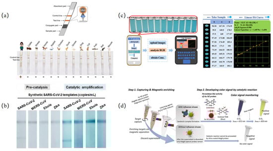 Colorimetric POCT platforms based on nanozymes. (a) Schematic illustration for CoFe2O4 nanozyme strip [87]. (b) FeS2 nanozyme strip for nucleic acid detection of SARS-CoV-2. FeS2 nanozyme strip for nucleic acid detection of other RNA viruses [88]. (c) Colorimetric analysis of different glucose concentrations using Fe@NCMzyme POCT platform [89]. (d) Working principle for the quantification of influenza viruses using MagLISA-based colorimetric diagnostics kit [91].
