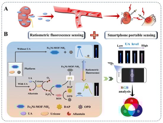(A) Schematic illustration of the accumulation process of UA in the human body. (B) Mechanism of the ratiometric fluorescent biosensor for UA based on the Fe3Ni-MOF-NH2 nanozyme and its smartphone-based portable sensing application [101].