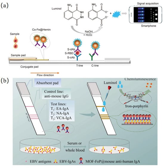 Nanozyme-based chemiluminescence detection platform. (a) Schematic illustration of the nanozyme chemiluminescence paper test for SARS-CoV-2 S-RBD antigen. Recognition, separation, and catalytic amplification by nanozyme probes [105]. (b) Schematic illustration of the preparation of MOF-FeP based strip and its application in detection of EBV-lgAs [106].