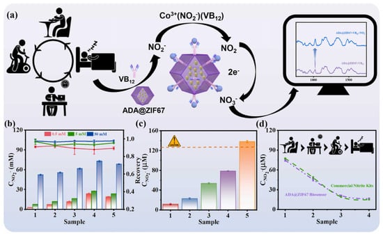 (a) ADA@ZIF67 diagram of nitrite detection when biosensors are used in human activities. (b) Detection values and recovery rates of nitrite with different concentrations (0.5 mM, 5 mM, 50 mM) added to food samples. (c) Determination of nitrite content in saliva samples of volunteers after eating different samples. The yellow bar indicates the threshold for nitrite concentration. (d) ADA@ZIF67 biosensor and commercial kit compared the volunteers’ nitrite levels during different activities [114].