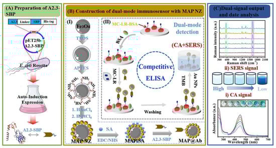 Schematic illustration of the colorimetric-SERS dual-mode immunosensor for rapid detection of MC-LR based on MAP@Ab probes catalyzed by TMB (CA signal for the colorimetric immunoassay and Au NPs enhanced signal for SERS detection) [121].