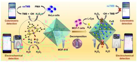 - Yu, K.; Li, M.; Chai, H.; Liu, Q.; Hai, X.; Tian, M.; Qu, L.; Xu, T.; Zhang, G.; Zhang, X. MOF-818 nanozyme-based colorimetric and electrochemical dual-mode smartphone sensing platform for in situ detection of H2O2 and H2S released from living cells. Chem. Eng. J. 2023, 451, 138321. [Google Scholar] [CrossRef]
