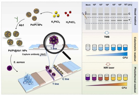- Liu, S.; Li, Z.; Li, C.; Liu, S.; Lang, Y.; Zhang, X.; Zhang, B.; Liu, C. A “three-in-one” multifunctional palladium/platinum nanoparticles-driven multimodal lateral flow immunoassays for point-of-care testing of Staphylococcus aureus. Sens. Actuators B Chem. 2024, 413, 135877. [Google Scholar] [CrossRef]
