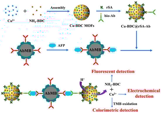 - Hu, X.; Wei, Z.; Sun, C.; Long, Y.; Zheng, H. Bifunctional antibody and copper-based metal-organic framework nanocomposites for colorimetric α-fetoprotein sensing. Microchim. Acta 2020, 187, 465. [Google Scholar] [CrossRef]