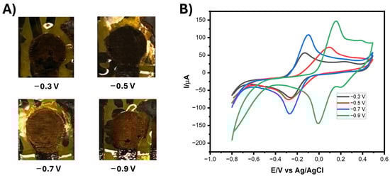 (A) Photographs of electrodeposited gold nanoparticles (AuNPs) on laser-induced graphene (LIG) electrodes at varied fixed potentials. (B) Cyclic voltammograms (CVs) of the LIG/AuNPs electrodeposited at varied potentials using 5 mM K3Fe(CN)6 containing 0.1M KCl as the redox probe. Scan rate: 100 mV.s−1.