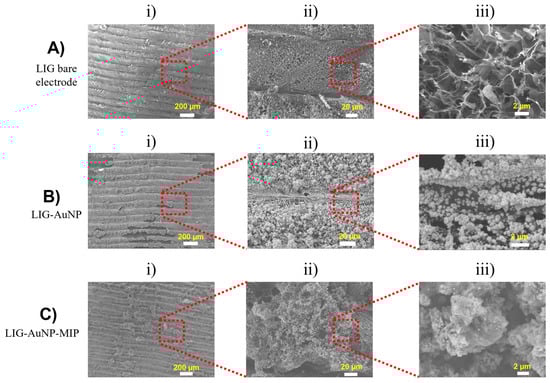 Scanning electron micrographs of electrode surfaces at increasing magnifications (left to right: i) ×70 ii) x550 iii) ×7000). (A) Bare LIG, (B) LIG/AuNPs, and (C) LIG/AuNPs/MIP.