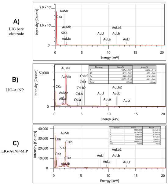 Energy-dispersive X-ray spectroscopy (EDS) was employed to assess the elemental composition of the modified electrodes (Figure 4). As expected, the bare LIG surface is overwhelmingly composed of carbon (~99.72%), with trace levels of oxygen and silicon. The latter likely originates from the underlying substrate or sample preparation processes [34,35]. Following AuNPs deposition, EDS spectra reveal the emergence of a strong gold signal, with Au (~65.59%) representing the highest mass percentage among detected elements. This observation corroborates the successful electrodeposition of AuNPs and is consistent with gold’s high atomic weight relative to carbon. Carbon remains the dominant species by atomic percentage, indicating that the bulk material remains LIG. The elemental profile of the final LIG/AuNPs/MIP configuration confirms the continued dominance of carbon and the persistent presence of gold. Importantly, oxygen content notably increases relative to previous stages, likely arising from the polymer matrix used in the MIP formulation. Trace elements such as aluminum, chlorine, and silicon appear in all configurations at low levels, attributable to sample handling, instrumentation, or electrode substrate interactions.