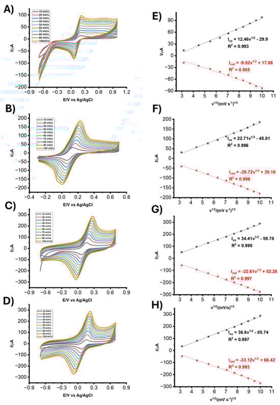 CVs of (A) bare LIG, (B) LIG/AuNPs, (C) LIG/AuNPs/NIP, and (D) LIG/AuNPs/MIP electrodes in 5 mM K3Fe(CN)6 containing 0.1M KCl. Scan rates: 10 to 100 mV.s−1. Corresponding Ipa vs. v1/2 for (E) bare LIG, (F) LIG/AuNPs, (G) LIG/AuNPs/NIP, and (H) LIG/AuNPs/MIP.