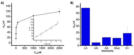 (A) Calibration curve showing the relationship between the oxidation peak current (ΔIox) and lactate concentration (CLA) ranging from 0.1 µM to 2500 µM. Inset: linear representation of ΔIox versus log(CLA). (B) ΔIox of the LIG/AuNPs/MIP biosensor in the presence of 10 µM LA, 100 µM uric acid (UA), 100 µM ascorbic acid (AA), 100 µM glucose (Gluc), and 100 µM potassium chloride (KCl). All measurements were performed in 5 mM K3Fe(CN)6 containing 0.1 M KCl and in triplicates.