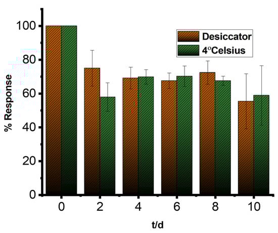 Figure 7 presents the results of a stability study comparing the electrochemical performance of LIG/AuNP/MIP sensors stored under two conditions: refrigeration at 4 °C and desiccation at room temperature. Throughout the study period, distinct trends were observed in signal retention and reproducibility. Notably, the biosensors stored in the desiccator exhibited more consistent current responses, as indicated by the narrower error bars, while those stored at 4 °C demonstrated greater signal fluctuations. The observed stability advantage under desiccator storage can be attributed to the reduced exposure to humidity and oxidative conditions, which likely minimized the degradation. This preservation of structural and functional integrity appears to be critical for maintaining the recognition properties of the imprinted sites and sustaining sensor performance. The increase in standard deviation over time, particularly in sensors stored at 4 °C, reflects gradual degradation of the MIP matrix or nanostructured surface. This may result from increased humidity exposure or oxidative effects, which impact the consistency of the sensor’s electrochemical response.