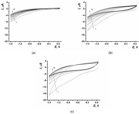 Cyclic voltammograms of ERGO obtained with different content of GO in NADES; (a) 0.2 mg/mL, (b) 0.33 mg/mL, (c) 0.6 mg/mL; SPCE, 0.05…−1.5 V, 0.1 V/s, 10 cycles. The arrows indicate the number of cycles.