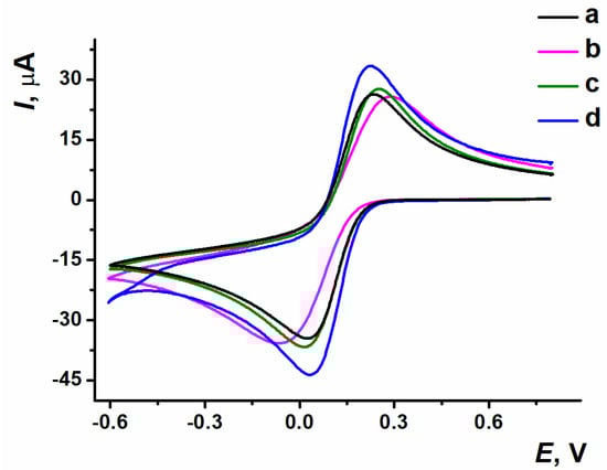 Cyclic voltammograms recorded on (a) bare SPCE; SPCE/ERGO with GO dispersion concentrations: (b) 0.2 mg/mL, (c) 0.33 mg/mL, (d) 0.6 mg/mL; 0.025 M PB, pH 7.0, 0.01 M K3[Fe(CN)6], 0.8…−0.6 V, 0.1 V/s.