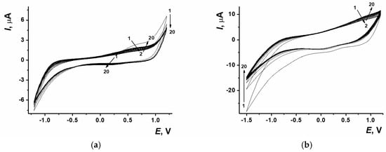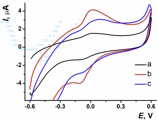 Along with the potentiodynamic mode of electropolymerization, the potentiometric and mixed modes have been tested (Figure S3). It is known that the electropolymerization in potentiodynamic mode results in the formation of a thin polymeric coating with satisfactory adhesion. As for the potentiostatic mode, it leads to a larger quantity of polymer being deposited but being wasted with side products [].