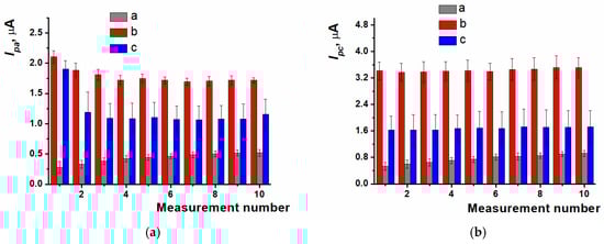 Response stability of (a) oxidation current values, (b) reduction current values on ERGO-PPFLNADES coatings obtained with (a) potentiodynamic; (b) potentiostatic; (c) mixed modes; 0.025 M PB, pH 7.0, −0.6…0.6 V, 0.1 V/s.