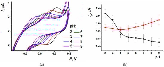 Electrochemical characteristics were established for the sensor based on SPCE/ERGO-PPFLNADES. Varying the pH value from 2.0 to 9.0 led to peaks of polymeric form shifting towards the cathodic potentials (Figure 6a). The response recorded for the reduction peak current at acidic pH values was quite stable, whereas the peak current increased in the range from 4.0 to 9.0. Oxidation peak current decreased in the 2.0–5.0 range; however, from 5.0 to 9.0 it was changed insignificantly (Figure 6b).