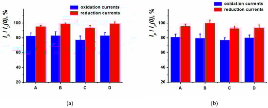Relative peak current changes (before (Ip(0)) and after (Ip) DNA incubation). Drying (A) and incubation for 5, 10, 20 min (B, C, D) in an aliquot of (a) DNAct, (b) DNAss. Cyclic voltammetry, 0.025 M PB, pH 7.0, −0.6…0.6 V, 0.1 V/s.