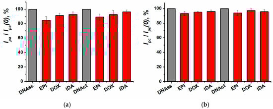 Relative changes of peak currents for (a) oxidation, (b) reduction on SPCE/ERGO-PPFLNADES (before (Ip(0)) and after (Ip) incubation in 100 nM anthracycline). EPI—epirubicin, DOX—doxorubicin, IDA—idarubicin.