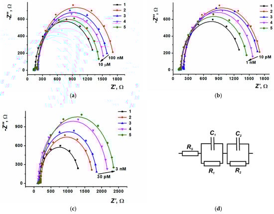 Nyquist diagrams for (a) doxorubicin, (b) epirubicin, (c) idarubicin. Layer content: 1—SPCE/ERGO-PPFLNADES, 2—SPCE/ERGO-PPFLNADES/DNAss, (3a)–(5a) SPCE/ERGO-PPFLNADES/DNAss/DOX (100 nM, 1 µM, 10 µM), (3b)–(5b) SPCE/ERGO-PPFLNADES/DNAss/EPI (10 pM, 100 pM, 1 nM), (3c)–(5c) SPCE/ERGO-PPFLNADES/DNAss/IDA (30 pM, 300 pM, 3 nM), (d) Equivalent circuit used for the EIS parameters evaluation.