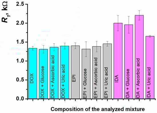 The Nyquist diagram consisted of two semi-circles corresponding to electron transfer in the limiting step of electron exchange at the inner and outer interfaces of the modifying coating. For electrochemical impedance parameters calculation, the equivalent cell scheme R(R1C1)(R2C2) was used, which allowed the interpretation of the measurement results at the modifying layer-solution and electrode-modifying layer interfaces. The appropriate changes of charge transfer resistance (R1) and surface layer capacity (C1) depending on the anthracycline concentrations are shown in Figure S5.