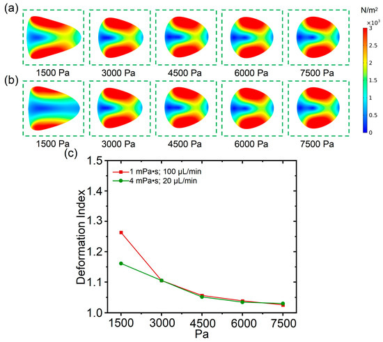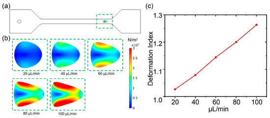 (a) The influence of cell Young’s modulus on deformability under a fluid viscosity of 1 mPa·s and a flow rate of 100 μL/min; (b) the influence of cell Young’s modulus on deformability under a fluid viscosity 4 mPa·s and a flow rate of 20 μL/min; (c) cell deformation index when cell Young’s modulus increases from 1500 Pa to 7500 Pa.