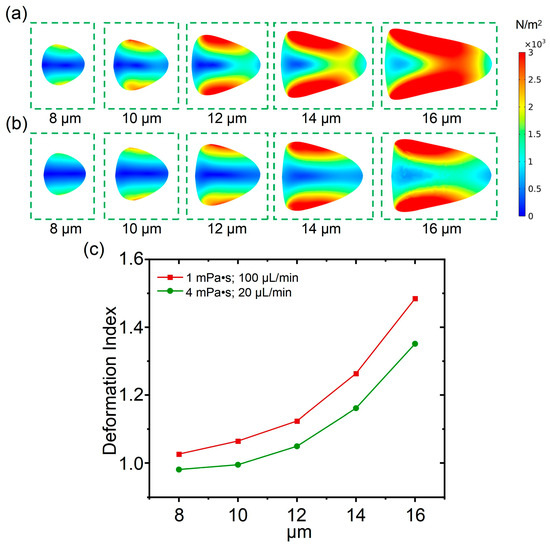 In this section, the influence of cell diameter on cell deformability is analyzed. As shown in Figure 4a, under the condition with a fluid viscosity of 1 mPa·s and a flow rate of 100 μL/min, the cell deformability was calculated with the cell diameter ranging from 8 μm to 16 μm (with an interval of 2 μm), which was used to simulate the leukocyte subpopulation in animal blood cells, such as neutrophils and lymphocytes. From Figure 4b, under the condition with a fluid viscosity of 4 mPa·s and a flow rate of 20 μL/min, the cell deformability was also calculated when the cell diameter ranged from 8 μm to 16 μm (with an interval of 2 μm). It was found that the cells on both sides along the channel direction are subjected to significant shear stress, while the cell deformation increased with increasing of cell diameters. Under conditions with a determined flow rate and fluid viscosity, cells with larger diameters tended to be squeezed into an approximate triangle shape, and the cell aspect ratio was larger as well. Compared to the condition with a fluid viscosity of 4 mPa·s and a flow rate of 20 μL/min, the shear stress impacted the cells, and the cell deformation was larger under the condition with a fluid viscosity of 1 mPa·s and a flow rate of 100 μL/min. In addition, compared with cell deformation induced by a varied flow rate or fluid viscosity, it is apparent that the influence of cell diameter on cell deformability was more significant. Subsequently, the cell deformation index for cells with diameters ranging from 8 μm to 16 μm was calculated to quantify the specific cell deformability. From Figure 4c, it can be observed that the cell deformation under the condition of a fluid viscosity of 1 mPa·s and a flow rate of 100 μL/min was more significant than that of the condition with a fluid viscosity of 4 mPa·s and a flow rate of 20 μL/min, which is consistent with the observation in the distribution diagram of shear stress. Moreover, compared to the linear relationships between cell deformation and flow rate, or between cell deformation and fluid viscosity, the increasing rate of the deformation index is faster than the increases in cell diameter.
