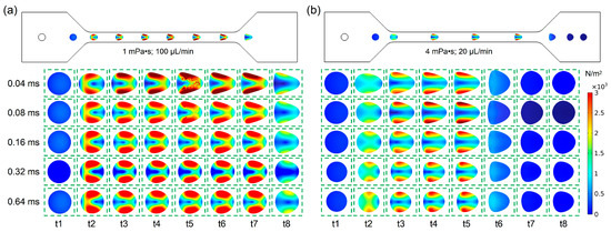 As shown in Figure 6a, under the condition with a fluid viscosity of 1 mPa·s and a flow rate of 100 μL/min, the cell deformability was calculated and simulated when the cell relaxation time ranged from 0.04 ms to 0.64 ms. From Figure 6b, it can be observed that under the condition with a fluid viscosity of 4 mPa·s and a flow rate of 20 μL/min, the cell deformability was calculated and simulated when the cell relaxation time ranged from 0.04 ms to 0.64 ms. To clearly display the influence of relaxation time on cell deformation, the cell deformation at eight time points (t1~t8) is displayed as the cell it passes through the channel of a deformation cytometry. By comparing the shear stress distribution, shown in Figure 6a,b, it was found that the cell deformation under the condition with a fluid viscosity of 1 mPa·s and a flow rate of 100 μL/min was larger than that noted under the condition with a fluid viscosity of 4 mPa·s and a flow rate of 20 μL/min. This result demonstrated that the influence of flow velocity on deformation is greater when the relaxation time was fixed. In addition, the cell deformation gradually increased when the cell entered the channel inlet, while the cell deformation gradually recovered when the cell entered the channel outlet. Owing to the difference in relaxation time, there were also differences in the times for the cells to reach their maximum deformation and the time for the cells to recover. Furthermore, with the increase in relaxation time, the cell deformation in the channel gradually decreased.