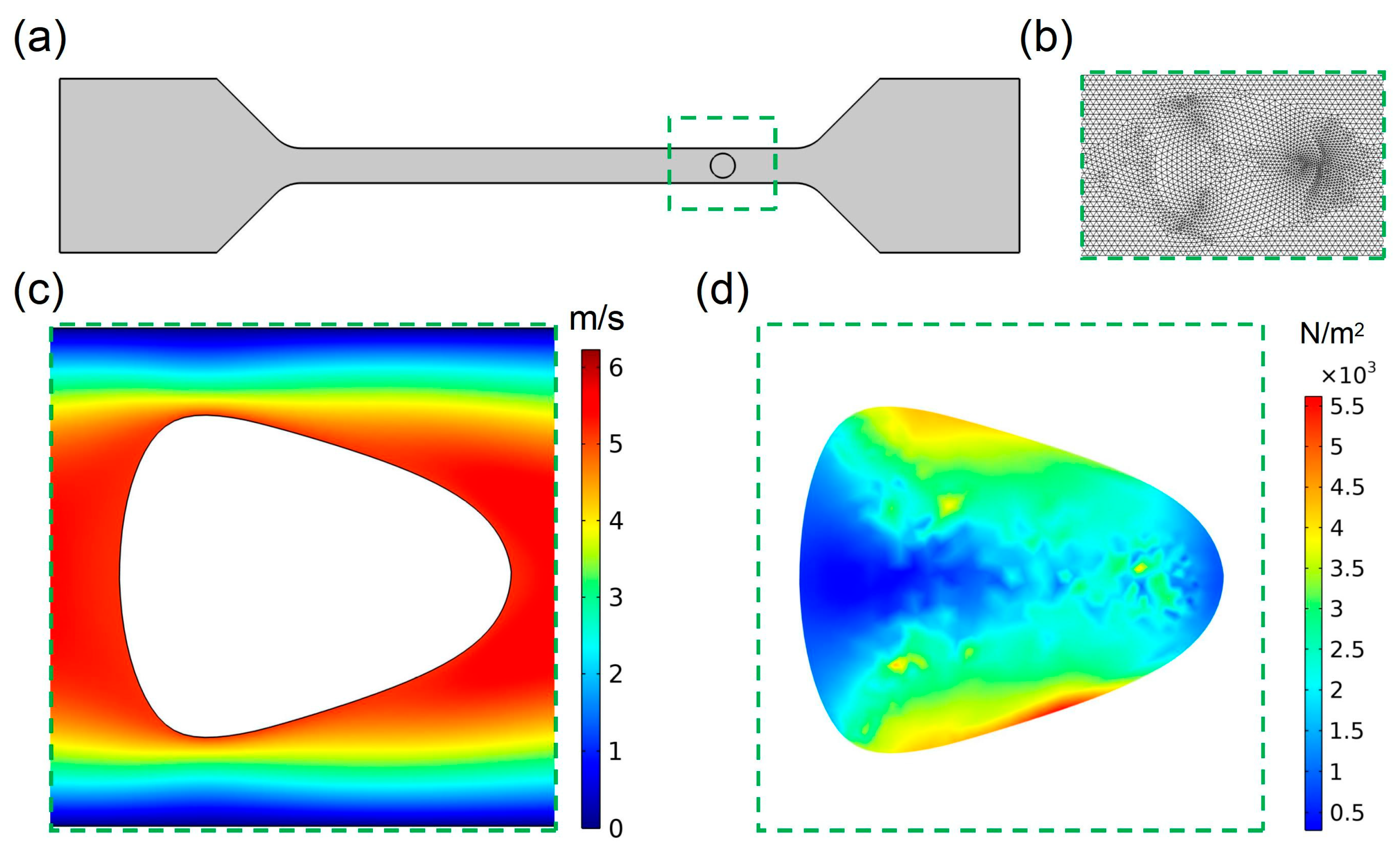 (a) Planar structure of the model; (b) mesh division of the model; (c) flow velocity distribution of the fluid around the cell in the channel; (d) stress distribution of the cell in the channel.