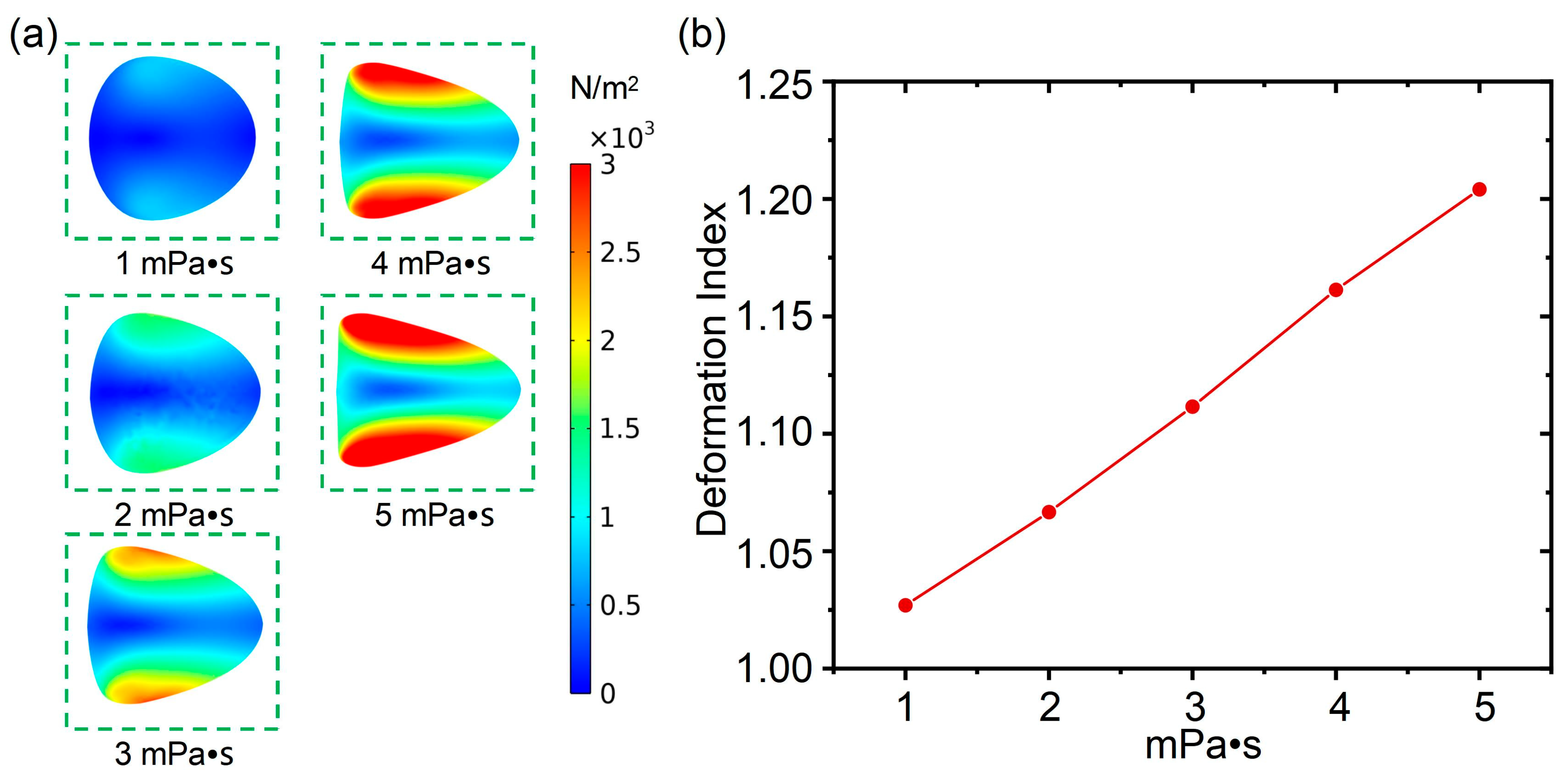According to the shear stress formula (Formula (4)), the magnitude of shear stress is also related to the viscosity of the fluid. Subsequently, the influence of fluid viscosity on cell deformability was explored. In this section, the deformability of cells under a low flow rate (20 μL/min) but a different fluid viscosity was calculated and simulated. As shown in Figure 3a, different cell deformations were observed when the fluid viscosity increased from 1 mPa·s to 5 mPa·s. Obviously, with the increase in fluid viscosity, the deformation of the cell gradually increased as well. Similar to the influence of flow rate on cell deformation, the shape of the cell in the plane gradually changed from an ideal circle to an approximate triangle with the increases in fluid viscosity. Moreover, the shape changes in the cells caused by fluid viscosity variations were also similar to those caused by differing flow rates. For example, the shear stress acting on the shape of the cell under a flow rate of 20 μL/min and a fluid viscosity of 4 mPa·s was nearly consistent with noted under a flow rate of 80 μL/min in the aforementioned section. Furthermore, to quantify the influence of fluid viscosity on cell deformation, the deformation index was also calculated. From Figure 3b, with the increases in fluid viscosity, the deformation index of the cell was gradually increased as well. Notably, the deformation index was over 1.20 under a flow rate of 20 μL/min and a fluid viscosity of 4 mPa·s, which is close to the deformation index calculated under a flow rate of 100 μL/min and a fluid viscosity of 1 mPa·s. Additionally, the approximate linear relationship between fluid viscosity and the deformation index was also observed. These results demonstrated the inference derived from the formula regarding shear stress, which is that the cell deformation can be manipulated by controlling the viscosity of the fluid when the flow rate is limited.
