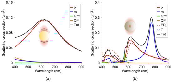 where and are the electric and magnetic multipole coefficients of the mth order and k is the wavenumber. The Mie coefficients and can be obtained by solving Maxwell’s equations with boundary conditions at the surface of a sphere, resulting in expressions involving spherical Bessel and Hankel functions and their derivatives evaluated at the size parameter and refractive index contrast. They describe the scattering of the electric and magnetic components of the incident light at each multipole order. Another option is to use numerical methods, as shown in Figure 1. The multipolar decomposition of scattering in subwavelength particles is investigated by decomposing the fields inside the particles into spherical and Cartesian multipole moments []. This figure compares the numerically computed multipole expansions of the scattering cross-section for a 100 nm gold and silicon nanoparticle performed with COMSOL 6.0.