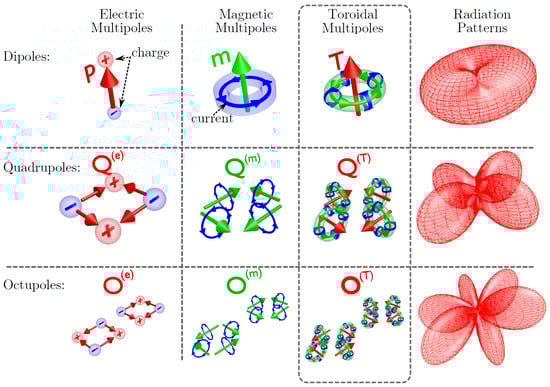 Three families of dynamic multipoles. The left columns show charge-current distributions for electric (p), magnetic (m), and toroidal (T) dipoles; electric (), magnetic (), and toroidal () quadrupoles; and electric (), magnetic (), and toroidal () octupoles. The toroidal dipole (T) arises from poloidal currents flowing along a torus’s meridians. Anti-aligned toroidal dipoles and quadrupoles form and , respectively. The right column displays their radiation patterns. Reprinted with permission, © 2014 by the American Physical Society (APS).