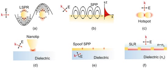 Localized surface plasmon resonances (LSPRs) are a phenomenon that occurs when conduction electrons on the surface of a metallic nanoparticle (usually gold or silver) oscillate collectively in response to incident light at a specific wavelength (see Figure 3a). These oscillations are “localized” because they are confined to the surface of individual nanoparticles, as opposed to extending across a bulk metal surface (SPP), Figure 3b. For instance, a spherical gold nanoparticle supports a localized plasmon resonance when and remains small [,]. Under these conditions, the enhancement of the near-field intensity can be enormous, which has driven seminal advancements in SERS and SEIRA. The design space for plasmonic materials spans a broad spectral range, from the visible and near-infrared (Au, Ag, Cu) [,] to the ultraviolet (Al, Ga, In, TiN) [,], and extends into the mid-infrared using III–V semiconductors or doped graphene []. Although reactive alkali metals (e.g., Li, Na, K) offer promising optical properties, their chemical reactivity poses stability challenges [].