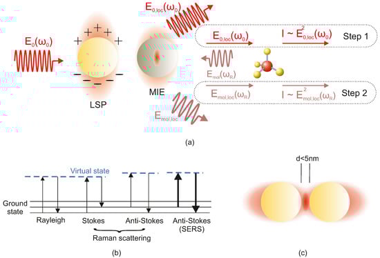 (a) Schematic of the two-step electromagnetic enhancement mechanism in SERS, illustrating both the LSP response and the Mie scattering contribution that boost the local electromagnetic field. (b) Jablonski diagram comparing ordinary Raman scattering (Stokes, anti-Stokes) with the additional enhancement achieved in SERS. (c) Illustration of two closely spaced nanoparticles (d < 5 nm) forming a hot-spot, where the local field is maximized for optimal SERS enhancement.