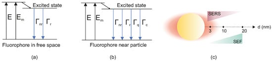 Electromagnetic Enhancement: There are two primary electromagnetic effects that a metal nanostructure has on a nearby fluorophore: (1) an enhanced local excitation field (the same effect that drives SERS) and (2) an alteration of the fluorophore’s radiative and non-radiative decay rates due to coupling with resonances (a Purcell effect). The excitation enhancement means that the fluorophore’s absorption of the excitation light is increased by , boosting the initial excited-state population. Meanwhile, if the emission frequency is near a resonance, the fluorophore can couple to the nanoparticle and radiate its energy more efficiently (as plasmon-mediated radiation), effectively increasing its radiative decay rate . However, energy transfer to the nanoparticle can also open a non-radiative decay channel (dissipating energy as heat in the metal), increasing the non-radiative rate . In Figure 5a,b, the energy-level diagrams compare the fate of an excited fluorophore’s energy in free space (a) versus in the near-field of a nanostructure (b). In free space, the main channels for de-excitation are radiative emission () and intrinsic non-radiative decay (). When a fluorophore is brought close to a nanoparticle, additional decay pathways become possible—namely quenching or energy transfer to the nanoparticle () and enhanced radiative emission (). These new channels shift the balance between radiative and non-radiative processes, enabling the fluorescence intensity to increase or decrease depending on the exact fluorophore–nanoparticle distance. Then, the fluorescent quantum yield of a molecule is defined as for its excited state. In the presence of a metal, this becomes