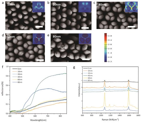 (a–e) SEM images of a nanoflower array with a gold layer thickness of 10, 20, 40, 60, 80 nm, respectively. All scales in the figure indicate 150 nm. The insets show FDTD-simulated maps of the normalized electric-field magnitude taken in the equatorial XY plane of each nanoflower under normal incidence of a 633 nm plane wave. (f) Reflectance spectra of nanoflower arrays of various gold layer thicknesses. (g) The SERS spectra of benzoic acid (1 × 10−3 M) on the nanoflower array. Reprinted with permission from []. Copyright 2019 John Wiley and Sons.