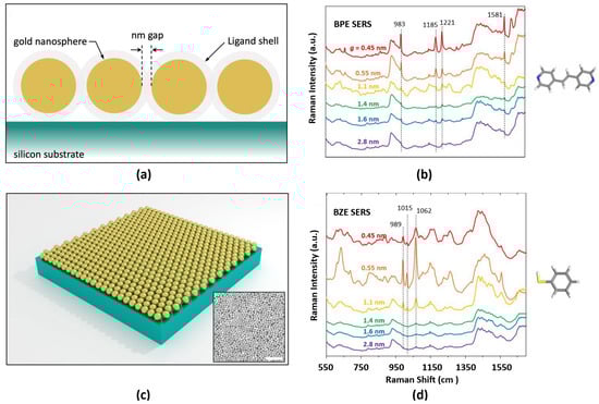 Depiction of Au nanosphere self-assembled metasurface on a Si substrate. (a) Cross-sectional view with Au nanospheres, nanoscale gaps, ligand shells, and Si substrate labelled. (c) Three-dimensional schematic of the resulting metasurface (not to scale and zoomed to show Au particles approaching all substrate edges, which may not necessarily occur during fabrication). Inset is a TEM image of a metasurface with 0.55 nm gaps (100 nm scale bar). And waterfall-plotted SERS spectra for a range of metasurface gap values from 0.45 to 2.8 nm. Enhanced Stokes shift peaks were observed for samples containing (b) trans-1,2-bis(4-pyridyl)-ethylene (BPE) and (d) benzenethiol (BZT). Reprinted with permission from []. Copyright 2022 American Chemical Society.
