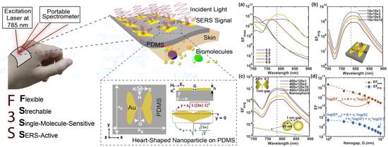 Furthermore, the development of flexible and stretchable sensors has propelled SERS technology toward integration with portable devices for real-time biosensing. Haque et al. (2023) introduced a flexible, stretchable, and single-molecule-sensitive SERS-active (F3S) sensor based on a heart-shaped gold nanodimer array fabricated on a biocompatible PDMS substrate []. This plasmonic metasurface demonstrates an unprecedented combination of high SERS enhancement (up to 10¹¹), large hot-spot volume, and mechanical robustness under significant deformation, making it particularly well suited for wearable and in vivo applications. As illustrated in Figure 8, the sensor can be laminated directly onto the skin, enabling label-free biochemical analysis of sweat using a portable Raman spectrometer. Numerical simulations confirmed consistent SERS performance under bending up to 100° and stretching up to 50%, with only a minimal decrease in the enhancement factor. It is important to note that these results are based solely on simulations, and experimental validation of the sensor’s performance under such mechanical strain remains an open challenge. Notably, Figure 8 highlights the device’s maximum and average enhancement factors at various nanogap sizes and volume scales, showing that even with a relatively large 5 nm gap, the metasurface achieves SERS performance far exceeding that of conventional nanostructures (i.e., the widely used sphere, rod, disk, cube, void or mesh-based dimers/arrays). These results underscore the potential of the sensor in personalized medicine, offering real-time, non-invasive biomarker detection with single-molecule sensitivity in a mechanically flexible and scalable platform.