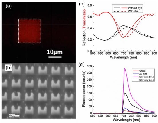 - Luo, S.; Li, Q.; Yang, Y.; Chen, X.; Wang, W.; Qu, Y.; Qiu, M. Controlling fluorescence emission with split-ring-resonator-based plasmonic metasurfaces. Laser Photonics Rev. 2017, 11, 1600299. [Google Scholar] [CrossRef]