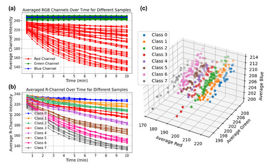 To quantitatively analyze the kinetics of color change, a region of interest (ROI) within the vial was manually cropped from each captured image and used to extract the average RGB intensity values. Figure 1a shows the average intensity of red, green, and blue channels over time for different samples. As illustrated, the red channel intensity decreased significantly over time, while the green and blue channels remained relatively stable. This suggests that the red channel carries the most discriminative information related to the yellow color development. To evaluate class-wise trends, we computed the average red channel intensity curves for all eight classes. Figure 1b displays the kinetics of red channel intensity over time, grouped by -amylase class. The data show that higher -amylase concentrations (e.g., Classes 5–7) result in a faster drop in red intensity, indicating rapid color development, whereas lower concentrations (Classes 0–2) show a slower and more gradual intensity decrease. Similarly, Figure 1c displays the average RGB intensities of a larger set of samples captured at the 10-min mark, visualized in the RGB color space. Each point represents a sample, color-coded by its corresponding -amylase class. The plot reveals that samples with different concentration levels tend to cluster in distinct regions, particularly along the red channel axis, which further highlights the discriminative power of red channel intensity.