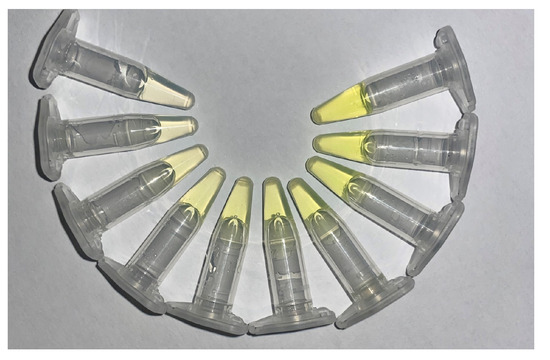 This time-resolved analysis was particularly important for identifying the optimal window for classification, as class-wise separation increased over time. By 10 min, RGB intensity values, especially in the red channel, were clearly distinguishable across classes, with minimal overlap. This motivated our decision to use t = 10 min images for training machine learning models, as this frame provided the highest inter-class separability. Finally, visual observation supported the quantitative findings. As shown in Figure 2, the vials at 10 min exhibited a clear yellow gradient corresponding to increasing -amylase concentrations (from the left to the right), reinforcing the relationship between enzyme level and color intensity development.