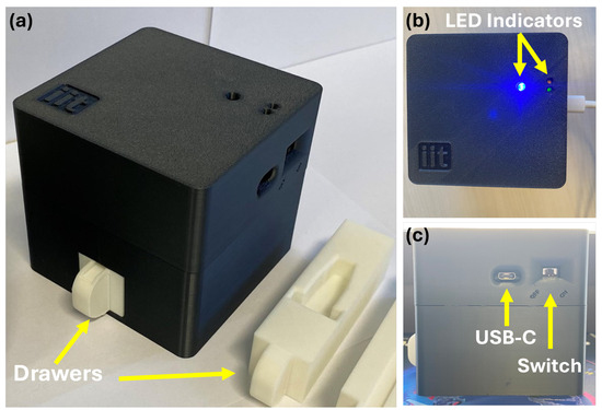 Images of the SCHEDA device. (a) Perspective view showing the main enclosure and removable drawers designed to hold reaction vials. (b) Top view with LED indicators. (c) Side view showing the USB-C charging port and power switch.