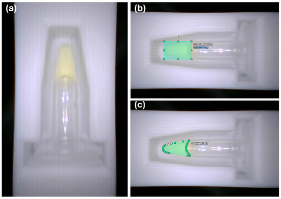 Example of dataset annotations. (a) Original image acquired by the device camera showing a vial positioned in the drawer, along with the image resolution. (b) Bounding box annotation used for YOLOv4-CNN training. (c) Pixel-wise segmentation mask used for YOLOv8 training.