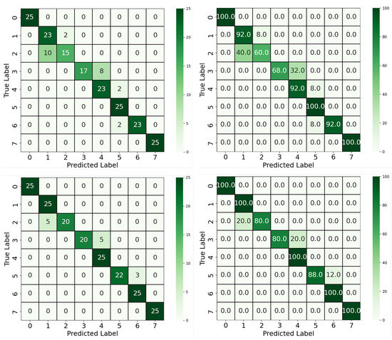 Confusion matrices for the YOLOv4-CNN approach. Top: RGB input; Bottom: Red-channel-only input. Left panels show sample counts; right panels show percentage accuracy per class.