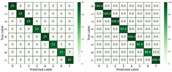 We first compared the two-stage YOLOv4-CNN pipeline using two input configurations: full RGB images and red-channel-only images. As shown in Figure 5, the RGB-based approach achieved an accuracy of 88%, with some confusion observed between neighboring classes, particularly between Classes 1 and 2 and Classes 3 and 4. These confusions can be attributed to the visual similarity in overall color tones when using all three channels, which may dilute the discriminative signal. In contrast, the red-channel-only approach yielded a notable improvement, achieving 93.5% accuracy. As supported by the color analysis in Section 2.2, the red channel offers the most separable signal across concentration levels. This improvement confirms that focusing the classifier on the most relevant color channel can enhance performance while also reducing model complexity. Moreover, five out of eight classes achieved 100% classification accuracy using the red-channel input, compared to only three classes in the RGB-based model, further highlighting the discriminative power of the red spectrum in this colorimetric classification. Beyond classification accuracy, this approach offered architectural and computational advantages. By reducing the dimensionality of the input to a single color channel and adopting a 1D convolutional architecture, we achieved a leaner model that is both more computationally efficient and easier to interpret.