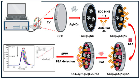 Before being employed, the glassy carbon electrode (GCE) was meticulously polished to provide a smooth, consistent surface, and sonicated for 30 min. Each step of the immunosensor development process was characterized by cyclic voltammetry (CV). First, 5 mL of 10 mM phosphate buffer solution (PBS) of pH 7.4 was measured and poured into a glass vial with a three-electrode setup, i.e., the working electrode, the reference electrode, and a platinum wire counter electrode. Then, CV measurements were carried out on the bare GCE at a scan rate of 50 mV/s in the potential window of −1.0 to 1.0 V, and the measurement values were recorded for the bare GCE. Then, the GCE was modified with 10 μL (10 mg/mL) of AgNCs and left overnight to dry before the CV was repeated. This time, the measured values were labelled as GCE/AgNC. After gentle rinsing with deionized water and PBS, the electrode was modified with 1-ethyl-3-(3-dimethylaminopropyl) carbodiimide/N-hydroxy succinimide (EDC/NHS) cross-linking chemistries for 30 min. at room temperature, for activation of the amine groups to bind covalently to the carboxyl groups of the antibody. Next, 50 μL of (10 μg/mL) of the antibody (Ab) was drop-coated on the electrode and left to dry for 1 h, forming the GCE|AgNC|Ab. Next, 20 μL of 1% BSA was drop-coated onto the electrode for 1 h to block non-specific binding sites, forming the GCE|AgNC|Ab|BSA immunosensor. Each stage of the fabrication process was characterized by CV and SWV in 10 mM PBS (pH 7.4) at a scan rate of 50 mV/s in the potential window of −1.0 to 1.0 V. Finally, different concentrations of the PSA antigen were spiked into the electrochemical cell for detection, via SWV. The fabricated immunosensor GCE|AgNC|Ab|BSA was refrigerated at 4 °C when not in use. Figure 1 is the schematic representation of the immunosensor fabrication process.