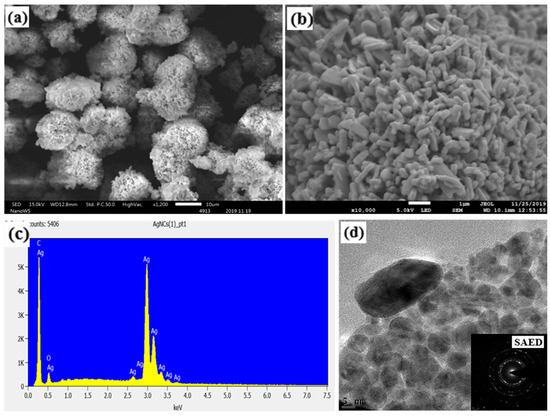 (a) SEM photomicrograph at ×1200, (b) FE-SEM photomicrograph at ×10,000, (c) energy dispersion X-ray spectroscopy graph, and (d) transmission electron microscopy image.